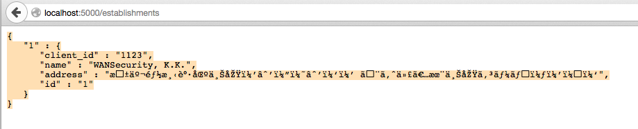 === use Dancer2; set serializer => 'JSON'; get '/' => sub { return +{ 1 => { address=> '東京都渋谷区上原2−48', client_id => '1123', id => '1', name => 'WANSecurity, K.K.', }, }; }; dance; ===